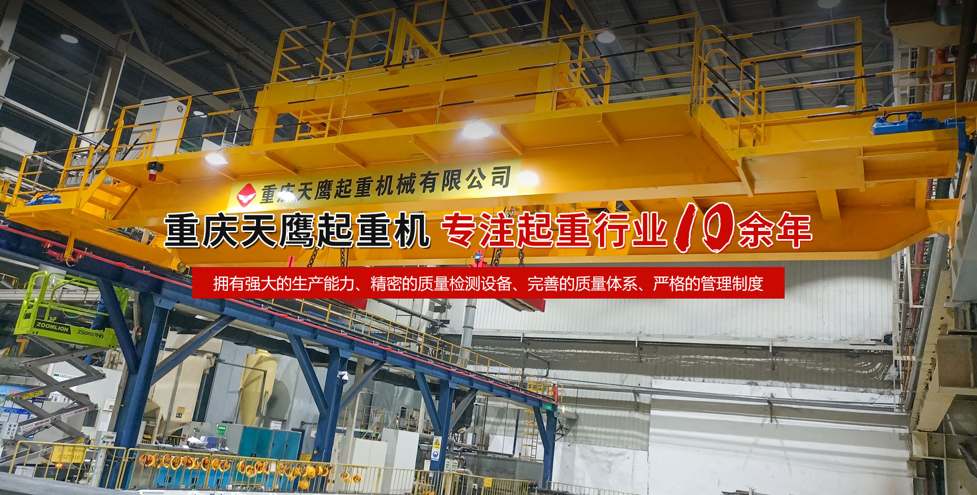 重慶天鷹起重機(jī)械有限公司成立于2014年,主營起重機(jī)的銷售、安裝和維護(hù)等相關(guān)服務(wù)。中國重型機(jī)械工業(yè)協(xié)會(huì)員單位、為中國工程機(jī)械工業(yè)協(xié)會(huì)工程機(jī)械維修分會(huì)會(huì)員單位及西南地區(qū)起重機(jī)械定點(diǎn)安裝維修單位。具有國家質(zhì)量監(jiān)督檢疫總局頒發(fā)的特種設(shè)備安裝維修改造質(zhì)格證書。并率先通過了IS09001-2000質(zhì)量體系認(rèn)證。 公司注冊資金3000萬元;廠房面積2萬平方米;各種生產(chǎn)檢測設(shè)備50臺套,公司技術(shù)力量雄厚,聘請了國內(nèi)知名起重機(jī)專家、工程技術(shù)人員擔(dān)當(dāng)項(xiàng)目經(jīng)理、技術(shù)總工程師及顧問。現(xiàn)擁有員工100多人,其中工程技術(shù)人員12人。 主導(dǎo)產(chǎn)品為各類橋、門式起重機(jī)及輕小型起重設(shè)備,具備生產(chǎn)起重量200t及以下通用橋、門式起重機(jī)的能力,尤其在200t以下起重機(jī)產(chǎn)品上具備較強(qiáng)的市場競爭力,為許多行業(yè)設(shè)計(jì)制造了技術(shù)含量高、技術(shù)性強(qiáng)的起重設(shè)備,許多產(chǎn)品在原設(shè)計(jì)標(biāo)準(zhǔn)上進(jìn)行了較大的改進(jìn)、優(yōu)化和創(chuàng)新;其中NH型系列電動(dòng)葫蘆、HD型電動(dòng)單梁處于國內(nèi)高水平..... 好的產(chǎn)品品質(zhì)需要由較高的裝備水平來保證,公司購買了“大型數(shù)控落地鏜”、“數(shù)控切割機(jī)床”、“自調(diào)式焊接滾輪機(jī)”、“數(shù)顯液壓板料折彎機(jī)”、“超大型數(shù)控臥式車床”、“數(shù)控液壓水平下調(diào)式三輥卷板機(jī)”、“單柱移動(dòng)式立式車床”“擁有用于單梁生產(chǎn)的全國一條拋丸噴漆烘干線、葫蘆噴漆烘干線和全國較大的100T葫蘆試驗(yàn)臺和檢測中心”等各種先進(jìn)的加工設(shè)備,新建廠房面積近2萬平方米。 質(zhì)量是企業(yè)的生命,天鷹公司依據(jù)“ISO 9001國際質(zhì)量管理體系”標(biāo)準(zhǔn),制定并完善了公司的質(zhì)量管理體制。堅(jiān)持質(zhì)量體系的內(nèi)審和外審,將質(zhì)量管理工作落實(shí)到企業(yè)生產(chǎn)經(jīng)營的全過程。 您的微笑,是天鷹永恒的追求;天鷹的服務(wù),是您首要的選擇!因?yàn)槲覀儓?jiān)信:“誠信是本、質(zhì)量鑄就品牌”。為您服務(wù)是我們的榮耀,勤奮而進(jìn)取的天鷹人,時(shí)刻期盼著您的到來。